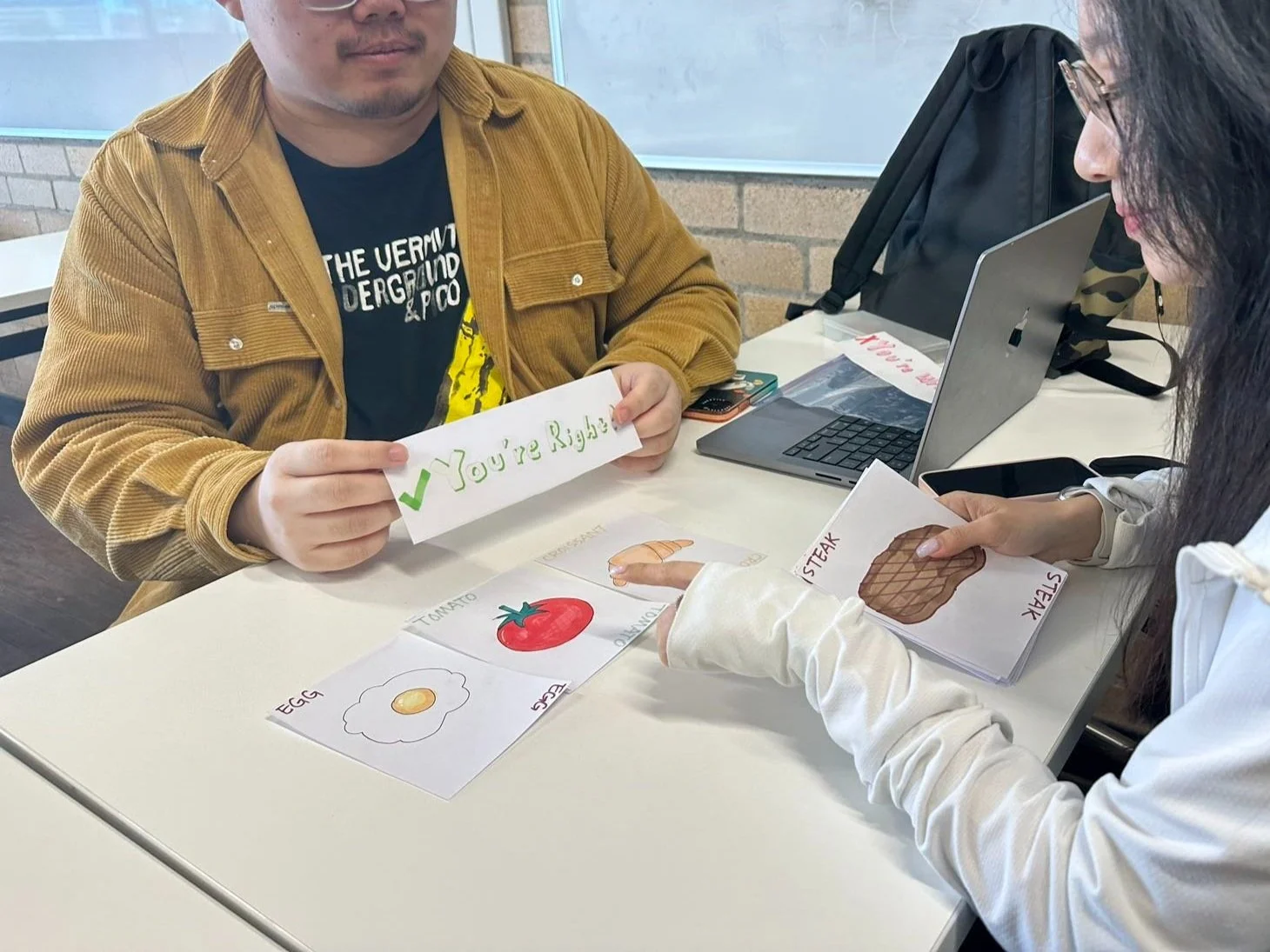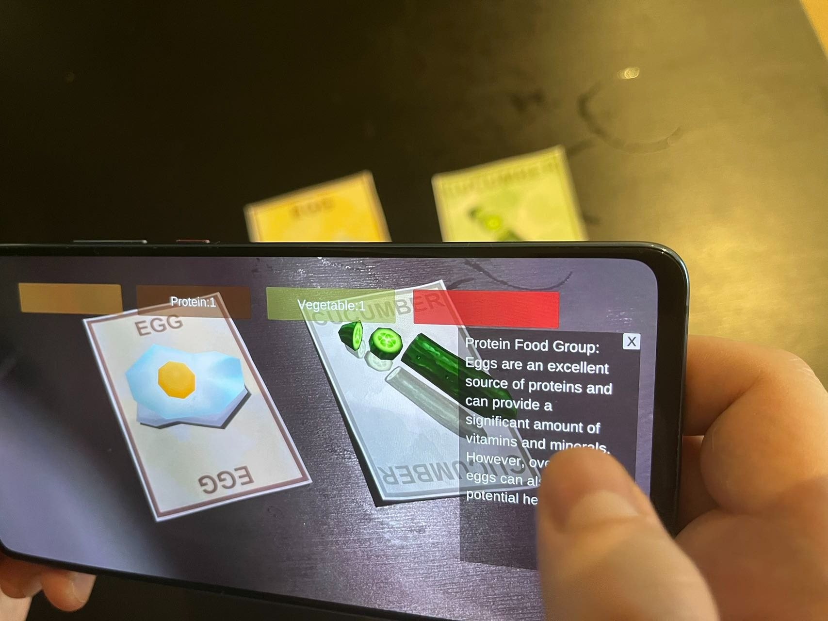 The operation of the software should be indoor classrooms with good condition of lighting. After teachers introduce the physical cards and the application, students can play with them individually or in small groups. Ideally, cards should be placed on the table for students to explore around the table with their devices and interactively educate themselves. As for interactions in the app, Students can touch the virtual models on the cards to hear and read details of it when presenting the food cards to the camera. They can also match three food together and test out if they know how to prepare healthy meals.
