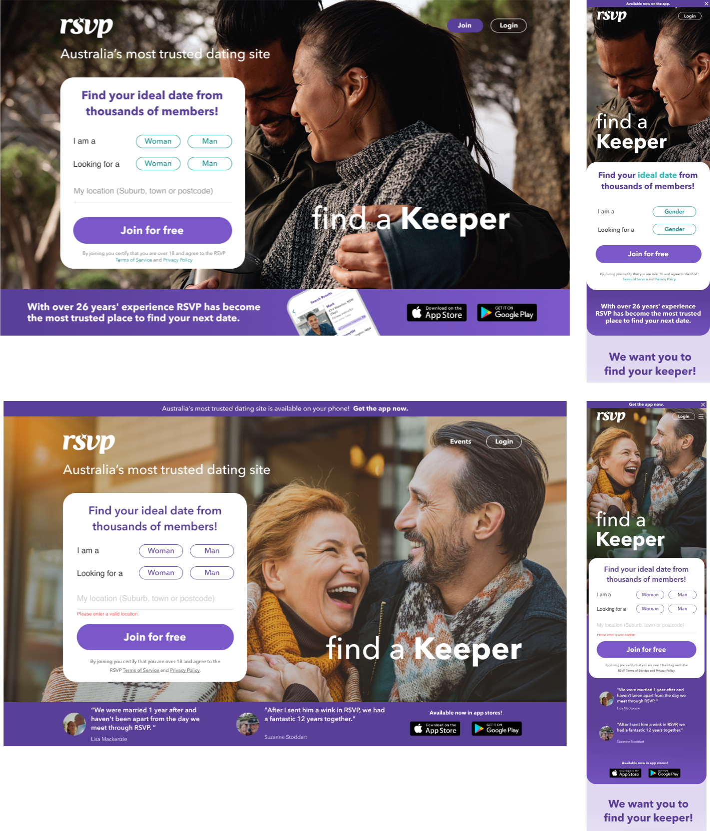 RSVP.com.au is Australia’s leading dating platform with a 26-year history, serving a diverse user base with an increasing emphasis on older demographics. In this role, I am expected to lead and shape RSVP’s digital experiences across mobile and web platforms to foster user engagement and growth, particularly focusing on accessibility and usability for an older audience. My expertise contributes to uplifting existing features, redesigning and creating multiple pages, conceptualizing and designing promotions and events to attract new users and boost conversions by encouraging free users to upgrade to paid plans. This role includes using data-driven insights to optimize conversion points, crafting experiences that increase user engagement, and experimenting with features or flows that facilitate onboarding, upselling, or re-engagement.